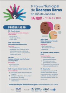 1º Fórum Municipal de Doenças Raras do Rio de Janeiro Data: 14 de novembro Horário: 13h às 18h Local: Auditório do Hospital Municipal Souza